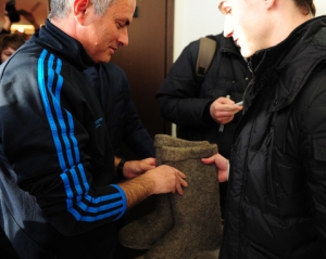 Необычный подарок наставнику команды сделал корреспондент издания "Советский спорт". Надеть валенки сразу же Моуринью отказался.