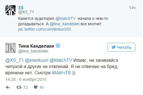 Вот так вот вполне прокремлевско-конформистская Канделаки угодила в русофобы. "Тина трудится в поте лица, ведь русофобов надо найти и уговорить работать на федеральном канале", – пишет один из пользователей твиттера в комментарии к записи в ее аккаунте. Причем пишет он это к записи, где она упоминает Рамзана Кадырова "Рамзан, твое жизнелюбие и энергия точно связаны с тем, что ты родился в день молодежи", – написала Тина, не догадываясь, видимо, что дружба с Кадыровым от обвинений в русофобии уже не спасает.