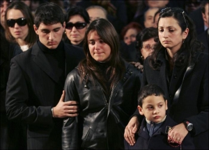 Филлиппо Рачити хоронили в Катанье 5 февраля. Жена Рачити Мариса Грассо (справа) стоит вместе с сыном Алессио. В центре - дочь полицейского Фабиана. Ее поддерживает друг семьи