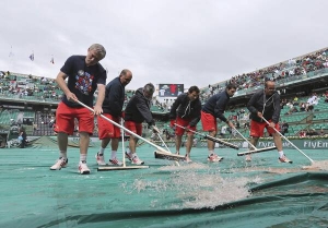 В Париже проходит открытый чемпионат Франции по теннису - один из четырех турниров из серии Большого Шлема. Соревнования прерывают из-за дождя - организаторы вынуждены применять защитное покрытие для кортов (на фото).