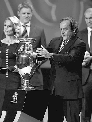 Гостей жеребьевки встречает ледяной Кубок Европы, флаги УЕФА, Украины, Польши и финалистов турнира. Красную дорожку не стелили. Больше чем за час до начала церемонии приезжает президент европейского футбольного союза Мишель Платини. Улыбается в камеры.