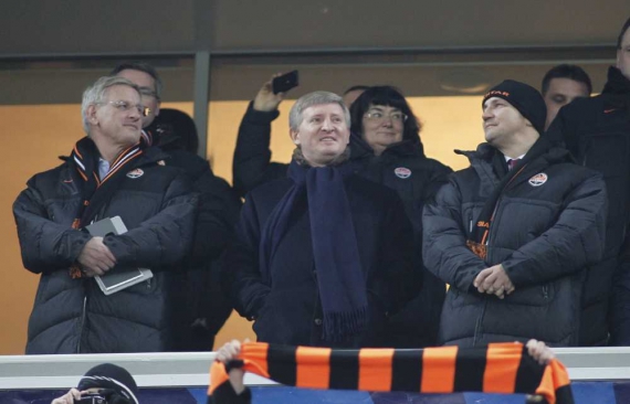 Добавим, что президент "Шахтера" Ринат Ахметов смотрел футбол в компании министров иностранных дел Польши Радослава Сикорского (в шапке) и Швеции Карла Бильдта. Интересно, что оба гостя были одеты в вещи с символикой донецкого клуба.