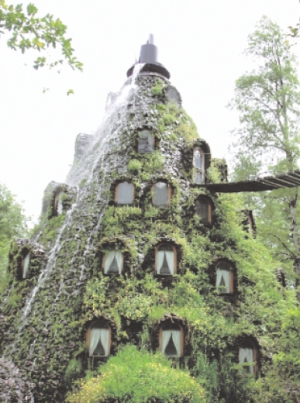 В чилийском заповеднике на юге страны построили гостиницу, которая напоминает гору. С крыши постоянно льется водопад. Внутри 13 номеров — они вырублены в скале. Попасть в гостиницу можно лишь через подвесной мостик.