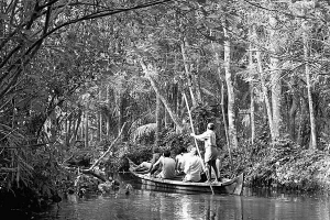 Потом плыли по узким каналам в джунглях.  Среди густых зарослей - старые деревянные дома.
