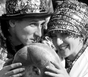Сергей с Натальей разламывают ковригу пополам, кормят друг друга крошками и приглашают всех к танцу.