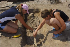 — Мы уже привыкли, вторую неделю здесь. Вот это останки женщины, потому что таз широкий, — показывает Оля, 20 лет, из Нежина на скелет, который расчищает. — А еще нашли на скелете украшения.