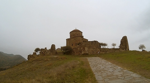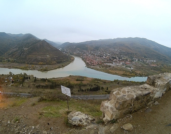 Залажу с саксофоном и рюкзаком. Меня за ним не видно. В храме были минут 10. С горы видно, как две реки сливаются в одну.