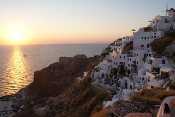 Туристы со всего мира приезжают на греческий остров Санторини в Эгейском море, чтобы увидеть удивительный закат. Когда небесное светило скрывается за горизонтом отдыхающие аплодируют и открывают шампанское.