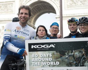 Велосипедист начал путешествие 2 июля с Парижа. Он проезжал через Европу, Монголию и Китай. Оттуда долетел в Австралию и снова сел на велосипед. В течение поездки мужчина побывал в 16 странах и проехал 30 тыс км. С ним всегда были рядом механик, диетолог, врач и менеджер. На днях он вернулся в Париж. У Триумфальной арки его встретили жена и дочери.
