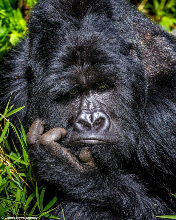 Серйозная гримаса самца гориллы в национальном парке Уганды повеселила посетителей и сеть.