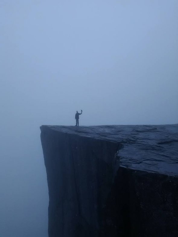 Летом мне жарко. А в Норвегии холоднее. Решил увидеть тамошнюю скалу под названием Язык Тролля. Это довольно популярное место среди туристов. Пешеходный маршрут от подножия горы до скалы составляет 10 часов для среднестатистического туриста. Думал, приеду, возле подножия заночую и на рассвете пойду. Прибыл после обеда. Решил подниматься на вечер туда. Все уже спускались. После 13:00 не рекомендуют подниматься. Однако я не послушал рекомендаций. Еще до сумерек поднялся на скалу. Там были домики, похожие на наши колыбы. Решил заночевать там.