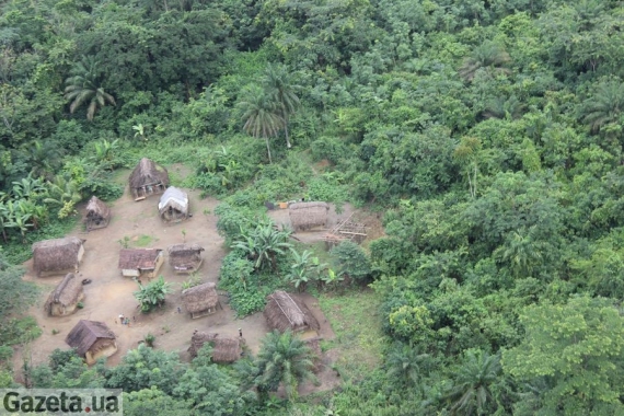 На высоте 400-600 метров раскрываются пейзажи местных джунглей. Где-где виднеются небольшие поселения на десяток домиков-мазанок крытых пальмовыми листьями. За ними горы, далее более-менее цивилизованные небольшие поселения. Они располагаются ближе к дорогам красного цвета. Земля здесь насыщена железной рудой. В местах, где заготавливают древесину, низкие шалаши, в которых рабочие пережидают дожди.