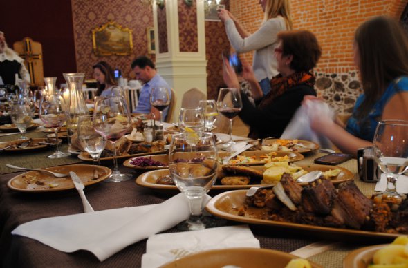 В ресторане, что в самом замке, меню зависит от времени года. Весна - время раков и запеченной баранины. Лето - кухня вегетарианская. Осень - грибы и дичь. Зимой готовят пироги, кнедлики и пызы. Последние сделаны на основе теста из муки и вареной картошки, начиненные мясом.