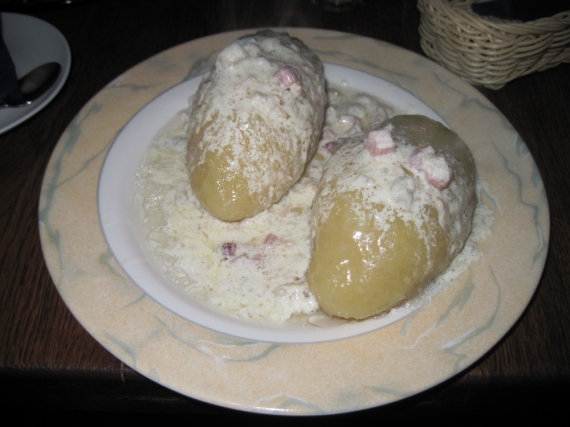 Главное национальное блюдо - цеппелины - есть не в каждом кафе, но официанты из соседних с радостью подсказывают, где мы можем их заказать. Готовят почти час, но мы приятно проводим это время. На столе горят свечи, кафе оформлено в стиле рок-клуба. Цеппелины - это большие "пельмени" из картофельного теста в сале. Очень сытные - порции из двух цеппелинов хватает на двух девушек.