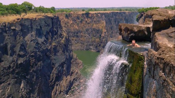 "Сначала надо зайти на территорию Национального парка "Водопад Виктория". В "сухой сезон" можно постоять на краю водопада и посмотреть, насколько он высок. Также этот период классный тем, что в скалах появляются естественные бассейны, где купаются и местные, и туристы", - говорит ведущий.