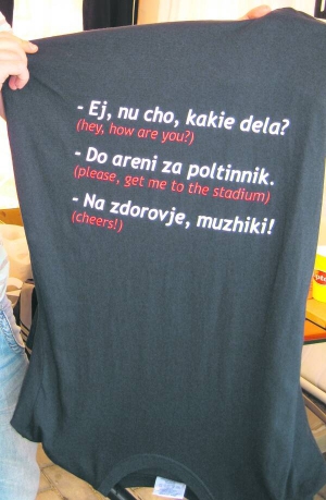 - Вот таких продали больше 100 штук - самый популярный товар, - продавец показывает черную футболку с надписью по-английски: "Я был в Донецке и теперь ничего не боюсь".