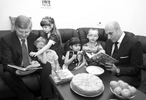 В воскресенье олигарх Ринат Ахметов с московским композитором Игорем Крутым поздравили сирот с днем Святого Николая. Утром побывали в детдоме семейного типа в городе Докучаевск. Около 11.30 подъезжают к макеевскому детскому дому "Пролески".