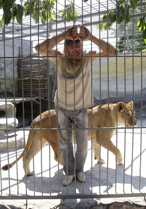 Во дворе его дома, в котором живет с женой и двумя детьми, есть мини-зоопарк. В нем три льва, медведь Миша, пара рысей, три собаки и немало мелких зверей. 2 августа он поселился в вольер к 9-летней львице. Планирует прожить там 35 дней.