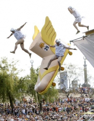 На Русановском канале в Киеве состоялся День безумных полетов "Ред булл флюг таг". 20 команд летали над водой на самодельных аппаратах в форме сельского туалета, жестянки, кочана кукурузы, сигары, авто. Их отобрали из 400 участников, которые подали заявки на участие в соревновании два месяца назад.