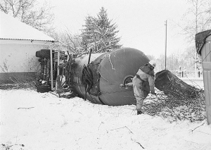 Чтобы забрать тягач, территорию расчистили от деревьев. Цистерна несколько дней простояла в доме. Дом от удара потрескался. Говорят, авария произошла из-за скользкой дороги.