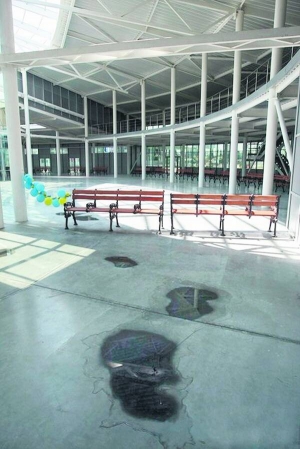 Вход в центральный зал перекрыт металлическими скамьями. Пассажиров не впускают. Пахнет краской. На полу - три большие лужи: перед открытием протекла крыша.