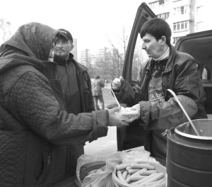 В очередь становятся с десяток людей. В пластиковые тарелки им кладут перловую кашу, сосиску и кусок хлеба, наливают горячий чай. Кушают здесь же — кто-то стоя, остальные сидя на асфальте и ограждении. — Очень вкусно, только сосиски какие-то серые, — говорит беспризорная 50-летняя Надежда Ивановна. — Хорошо, что нас кормят. Паспорт имею, только прописки нет. Из-за этого не могу устроиться на работу. Муж тоже был бомжем. Зима в этом году была холодная, так он на улице замерз. Дочь лежит в больнице в Глевахе (поселок под Киевом, где расположен диспансер для психически больных. — "ГПУ"). У нее шизофрения. — Каша вкусная, —довольно говорит чисто одетый пенсионер. Видно, что не бомж. Попить бесплатного чая подходит еще продавщица с соседнего рынка. "Социальный патруль" — проект христианского благотворительного центра "Стефания", на ул. Регенераторной, 4. — Там есть столовая, где их кормим. Но не все могут к нам добираться. Поэтому решили к ним ездить, — рассказывает 30-летний Артем Макеев, президент фонда "Социальное партнерство". — Три недели мы ездили по Левому берегу Киева. За день кормим от 160 до 200 человек. С сегодняшнего дня будем их кормить ежедневно. Еще поможем всем желающим помыться, привести себя в порядок, получить паспорта и устроиться на работу. Сейчас ездит три человека. Двое — бывшие беспризорные. Мы их взяли к себе на работу. По словам Макеева, в Киеве 12 тыс. бездомных. "Социальный патруль" будет курсировать ежедневно с 10.00 до 14.00 от ул. Кибальчича мимо рынка Юность к Дарницкому железнодорожному вокзалу.