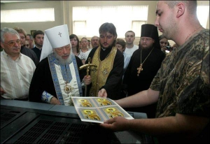 — Князь Владимир долго не принимал Крещения, был человеком, можно сказать, легкомысленным, — объясняет руководитель духовно-просветительских проектов архимандрит Феодосий. — Он постоянно откладывал обряд и потерял зрение. А когда принял Крещение в Херсонесе, то прозрел духовно и телесно. С тех пор его считают покровителем незрячих. Церковь планирует изготавливать тактильные иконы и других святых. — Вот здесь рамочка... А здесь написано: "Письмо-приложение", — директор Дома звукозаписи и печати Общества слепых Украины Петр Омельчук касается кончиками пальцев сопроводительного письма к иконе, написанного шрифтом Брайля. — Я потерял зрение после несчастного случая, поэтому мне сложнее прочитать икону. Чем позже это происходит, тем тяжелее овладеть методикой Брайля.