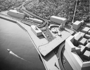 В первом варианте "Киевдормостпроекта" пешеходная площадь будет большой. Съезды и заезды спрячут в тоннель. Теперешний пешеходный мост снесут. На самой площади возведут торговый и офисный центры с двумя подземными паркингами. Около церкви Рождества Христова построят памятник с фонтаном. На набережной обустроят причал для яхт. Сделают эстакаду для съезда с Владимирского спуска на ул. Набережно-Крещатицкую. В тоннеле под площадью будут повороты: с Владимирского на Набережное шоссе и оттуда на Боричев спуск. Такой проект обойдется в 555 млн грн.