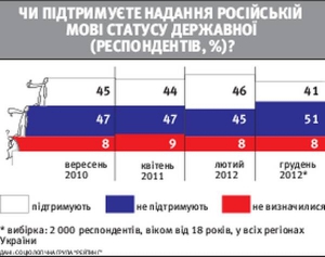 - Традиционно тех, кто поддерживает и не поддерживает - почти одинаковое количество. Разница между ними увеличивалась в период празднования 9 Мая, перед выборами, когда подписывают нечто вроде Харьковских соглашений с драками в парламенте и тому подобное. В июле 2012-го после принятия парламентом Закона о языках разница между "поддерживаю" и "не поддерживаю" выросла до 10 процентов. Эти показатели не изменяются пять месяцев. Тема языка была искусственно подогрета политиками во время избирательной кампании. Таким образом, выросло количество противников закона.