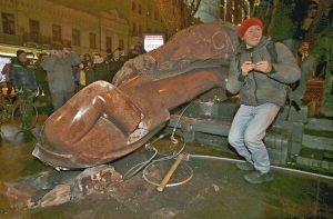 - А мне это не нравится, - говорит пожилой усач. Руки держит в карманах куртки. - Я - коренной киевлянин. Ленина не люблю и не уважаю. Но это памятник национального значения и произведение искусства. Это же не гипс - мрамор. Его надо было демонтировать и поставить в музей. Зачем было его так быстро уничтожать?