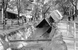 В Одессе грузовик с песком упал в 3-метровую по ширине траншею. Это произошло утром 10 октября напротив дома №22 по просп. Александровскому.