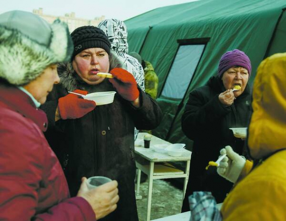 - Спасибо военным за еду, чай и кофе, - Ирина Свистельникова в куртке с лисьим воротником жует кашу. - Я работала на коксохимке. Сейчас - инвалид третьей группы.