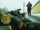 Вдоль улицы на столбах висят потрепанные сине-желтые флаги. При входе - объявление с мобильными телефонами полиции Донецкой области. На земле стоят пластиковые тарелки с объедками. Возле них вертятся собаки. Под ограждением сложены двухметровые кучи дров. На куче снега играются дети.