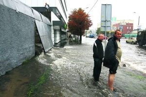 Река и дальше течет из Скляренко по Куреневскому переулку. Машины едут медленно, вода достает до фар. Район этот - промышленный, вокруг ни одного жилого дома. Из кусков вымытого асфальта кто-то намостил мостики для прохожих на тротуаре. Все газоны около дороги устланы мусором, бутылками, ветками, которые принесло течением. На соседних улицах - заторы. Половина прохожих - с подкачанными штанами. В расположенном рядом стоковом магазине "Чобіток" за утро продали семь пар резиновых сапог.