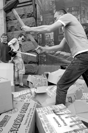 Перед центральным входом в магазин двое ребят выкладывают стену из 15 картонных коробок. К ним крепят надписи "Коррупция чиновников", "Коррупционный барьер", "Уничтожители книжного магазина", "Банда Черновецкого". Представитель магазина Константин Климашенко разбивает их деревянной битой. Потом срывает с зарешеченного окна плакат с изображением книг.
