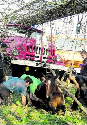 — Приехал спасательный отряд с автолестницей, — продолжает Филип. — Животное вытягивали 2 часа. С первого раза это сделать не удалось, потому что конь большой, а отверстие канализационного колодца — узкое. Спасатели разбили бетонную плиту и разрезали арматуру. Когда добрались глубже, заметили вонзенный в ребро коня железный прут. Животное было сильно перепугано, потому никто не мог спрогнозировать его поведение. Спасатель Сергей Батрак снаряжением обрезал металлический прут и вытянул его из тела коня. Туловище обвязали пожарным рукавом.