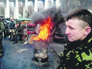 Во вторник, когда российский президент Владимир Путин заявил о принятии Крыма в состав РФ, на ул. Грушевского опять жгли покрышки. Около пятидесяти активистов возле входа на стадион "Динамо" забросили в бочку две шины.