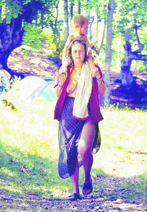28-летняя Виктория из Ивано-Франковска гуляет по "Шипоту" с ребенком Соломией, 3 года. На женщине длинное цветное платье. Русые волосы распустила, обвязала кожаным шнурком. Дочка бегает голышом.