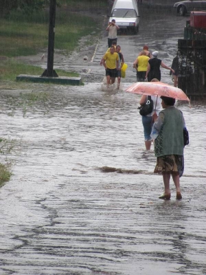 Через полчаса дождь утихает. Недалеко от ул. Павлика Морозова образуется глубокая лужа, которая покрывает всю дорогу. Машины стоят в воде по колеса. Водители подкатывают штаны, толкают авто. Люди разуваются и идут пешком.