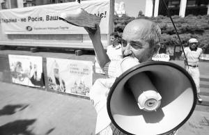 Через два дня патриарх провел в столице молебен по случаю 1024-ї годовщины крещения Руси. Его оберегали 30 охранников. Послушать службу пришли 500 прихожан. В это время под стенами Украинского дома митинговало около десятка активистов с флагами УНА-УНСО и УПА. Принесли собственную "Серебряную калошу" (премия русской радиостанции "Серебряный дождь " за самое сомнительное достижение в шоу-бизнесе. - "ГПУ"). Хотели вручить ее патриарху в номинации "Руки по локоть в чудесах". Так отреагировали на то, что глава русской церкви носит часы "Брегет" стоимостью $30 тыс. Милиционеры не пустили их к Кириллу.
