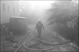 Нина Степановна опирается на тележку с купленными на рынке продуктами. Смотрит, как пожарные гасят догорающие киоски в ее дворе между улицами Межигорская и Хорива. В прошлый четверг там загорелся киоск, где сдавали макулатуру. Он расположен возле Министерства финансов на ул. Межигорской.