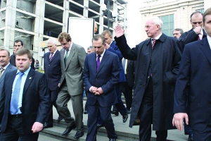Премьер приезжает о 9.10 на черном "мерседесе". Его сопровождают две "тойоты" с мигалками и черный микроавтобус. Выходят пятеро охранников. Азарова ожидает вице-премьер Борис Колесников, глава столичной горгосадминистрации Александр Попов. Журналистов охрана оттесняет от главы правительства на несколько метров.