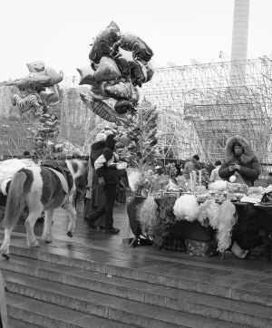 В 100 м от елки новогодняя ярмарка. За деньги угощают медом, пряниками, конфетами и булками. В 30 деревянных лотках продают куклы-мотанки, игрушки, сувениры. За 30-сантиметровую елку просят 100 грн, за куклу — 50. Самая длинная очередь возле палатки с глинтвейном и кофе. Рядом стоит 1,5-метровый пряник в целлофане. Неподалеку в мусорнике ищет бутылки бомж.