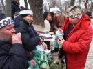 Четверо чернобыльцев разливают кипяток в пластиковые стаканчики. Бросают туда пакетики черного чая. За ними наблюдают 10 милиционеров. В 40 м стоит автобус с "беркутовцами". Их там около двух десятков.