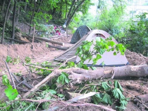 - У мангала греемся, когда холодно. Еду нам местные приносят. Спим в спальниках, - говорит женщина лет 50. Не называется. Пьет чай из синей чашки и начинает вспоминать, как валились деревья. - Где-то около десяти вечера услышали сильные толчки, думали, что землетрясение. Посмотрела в окно, а здесь трактора гребут все подряд. Звонила в милицию, но когда они приехали, то строители уже убежали. Милиция оставила пост, три ночи дежурили, а потом исчезли.