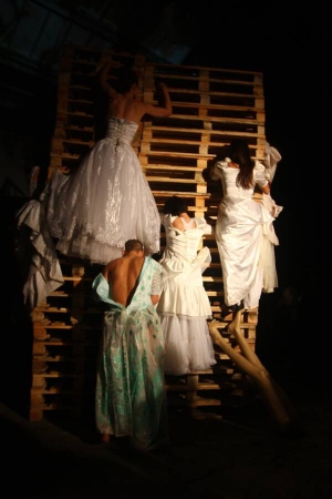 — Мы не разговариваем, — говорит 23-летняя женщина. Она в свадебном платье. Рядом еще с десяток невест и несколько ребят в платьях. Между ними четверо босых актеров в чёрных костюмах таскают чугунную ванну. 13 сентября в киевской промзоне на Выдубичах открыли международный фестиваль современного искусства "ГогольФест".