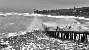 Женщина фотографирует мужчину на фоне 4-метровых волн на пирсе в поселке Гурзуф Ялтинского района. В связи с сильными порывами ветра и снегопадами в Крыму с 31 января по 3 февраля объявили штормовое предупреждение.