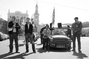 В 12.30 колонна из 10 машин во главе с "запорожцем" двинулась через ул. Сагайдачного к Владимирскому спуску. Дальше на Крещатик, Богдана Хмельницкого, Лысенко, бульв. Шевченко и просп. Победы. На дорогах заторы. Транспорт двигается медленно. Проезжие машины сигналят автоколонне, прохожие показывают пальцами и снимают все на мобильные телефоны.