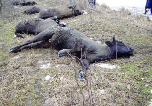 В селе Трибухи Литинского района на Виннитчине на этой неделе егери достали из пруда туши семи мертвых зубров. Их спугнули браконьеры, и животные провалились под лед.