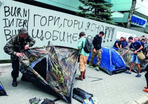 Утром 6 сентября стоит возле главного офиса телеканала "Интер" на столичной ул. Дмитриевской. Здание блокируют с полсотни людей. Большинство в военной форме. Часть — бойцы батальонов "Айдар" и "Донбасс". Не пропускают работников канала на работу. На железном заборе, которым огражден офис, рисуют краской: "Интер — агент ФСБ!" Стягивают несколько десятков шин.